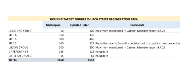 The attached table above lists all Masterplan development sites that demonstrates how the housing target figures have shifted over time. As the maximum number of homes agreed by Cabinet is 300 across both sites I entered the original figure for the site originally called “Lisson Grove” at Regent’s Canal: 200 and increased the figure for the development on Lisson Green to 100.