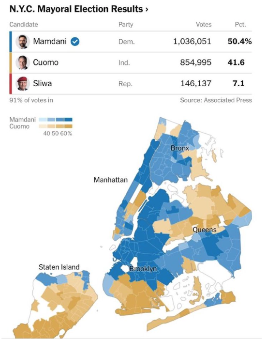 Now being the sister city of Greater London, there are some useful comparisons to be made in the analysis of the vote. For example, like in London, you need over 1 million votes to win the Mayoralty of New York. Not surprising as we have similar populations of just under 9 million when our population is distributed more widely and in New York is concentrated in a smaller area with a much higher population density. He managed to get just over a million with 1,036,051 making up 50.4 per cent of the vote. Whilst we have a crazy 32 boroughs, New York City has just 5 boroughs and he did particularly well in Manhattan, the Bronx and Brooklyn.